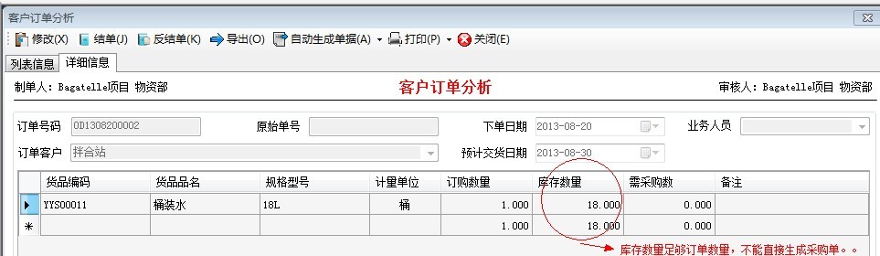 其次,客戶訂單分析這里,打開剛才做的客戶訂單,點擊自動生成采購單,在生產(chǎn)采購單這里有兩種情況:1.庫存數(shù)量足夠訂單數(shù)量,這個時候是不能直接生產(chǎn)采購單。2.庫存數(shù)量不足以訂單數(shù)量,這個時候我們可以直接生產(chǎn)采購單。