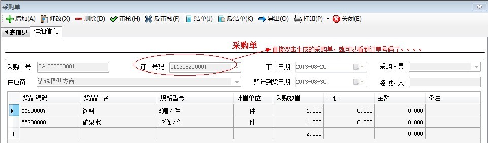 最后,采購單,我們就可以看到剛才生產(chǎn)的采購單據(jù),點擊詳細(xì)信息,就可以看到相關(guān)的訂單號碼。。。免費ERP系統(tǒng)原創(chuàng)文章,轉(zhuǎn)載請注明出處! 標(biāo)簽: 加工中心工資 連鎖店倉庫管理系統(tǒng)軟件 員工工資管理 軟件定制開發(fā) 哪里有倉庫管理軟件免費版 生產(chǎn)工序