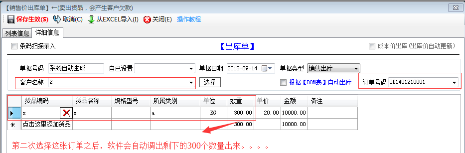 客戶訂單,訂購貨品500個,做出庫單,第一次根據訂單出庫200個之后,下次再做出庫單買,選擇這張訂單,軟件會自動調出剩下的300個貨品出來的。