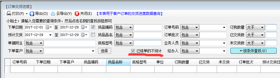 1.客戶訂單交貨進(jìn)度查詢界面,增加了查詢條件項目??梢园词欠窠Y(jié)單進(jìn)行統(tǒng)計查詢。