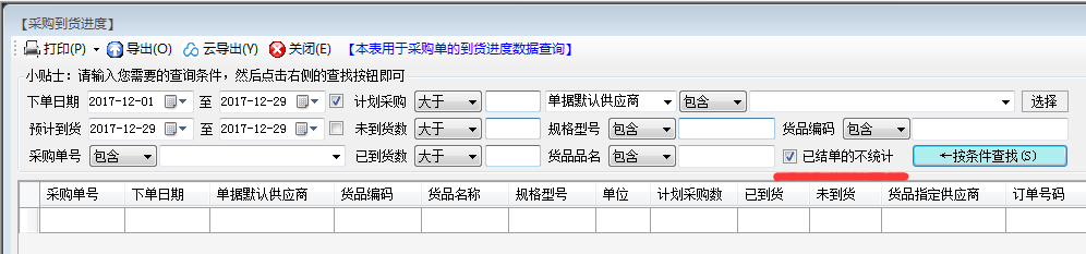 2.采購訂單到貨進(jìn)度查詢界面,增加了查詢條件項目??梢园词欠窠Y(jié)單進(jìn)行統(tǒng)計查詢。