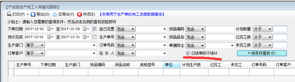 3.產(chǎn)成品生產(chǎn)完成入庫進(jìn)度查詢界面,增加了查詢條件項目。可以按是否結(jié)單進(jìn)行統(tǒng)計查詢。