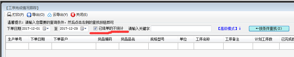 4.生產(chǎn)工序完成進(jìn)度查詢界面,增加了查詢條件項目??梢园词欠窠Y(jié)單進(jìn)行統(tǒng)計查詢。