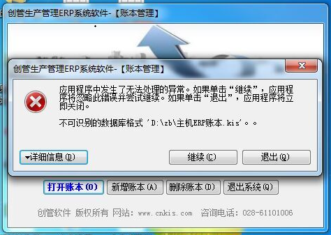 今天有個(gè)企管王生產(chǎn)管理ERP系統(tǒng)軟件的客戶聯(lián)系我們說,平時(shí)正常使用的ERP軟件正式版今天不能登錄了,點(diǎn)打開賬本的時(shí)候提示“不可識(shí)別的數(shù)據(jù)庫格式 D:\zb\主機(jī)ERP賬本.kis”。