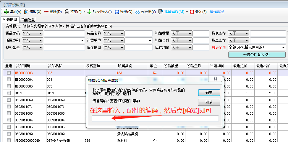 在彈出來的窗口上輸入你要查詢的配件的貨品編碼,再點擊確定按鈕即可,注意:配件的編碼一個字都不能輸錯哦……