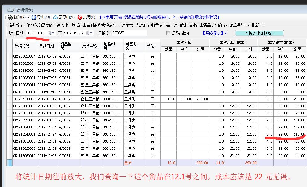 所以,進出存明細表里就必須統(tǒng)一成全部是成本價,這樣賬才能做平。下面的這個表,就可以清楚的查詢出來,此貨品在他12.1號出庫當時的成本價。