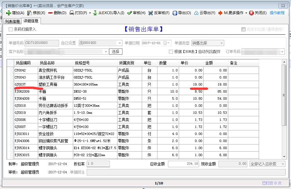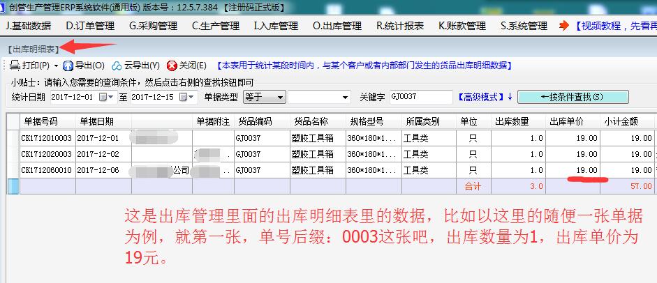下面這張截圖可以清楚的看到,GJ0037這個貨品,在這張出庫單上的出庫價格是19元。這種銷售出庫單上的單價,我們一般稱之為銷售價。