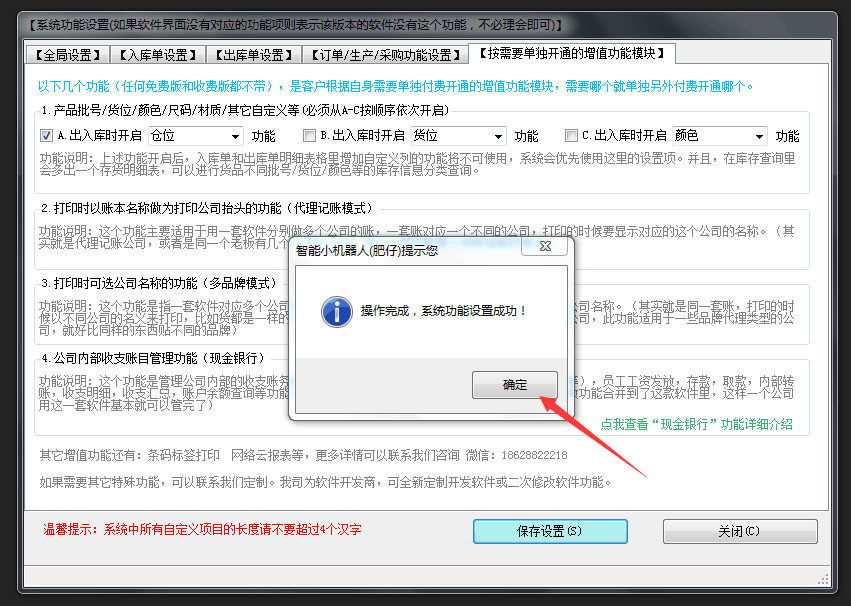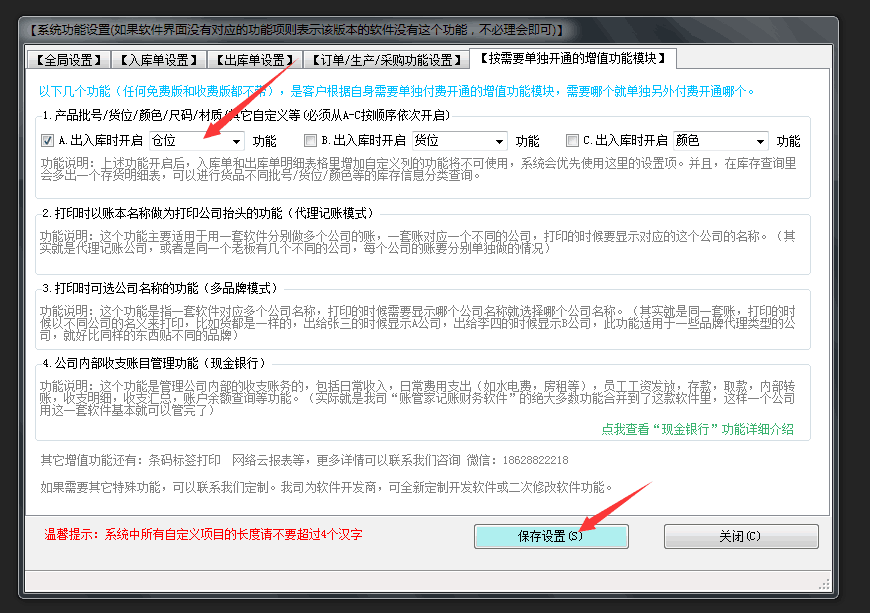 首先在【系統(tǒng)管理,系統(tǒng)設置,系統(tǒng)功能設置】中的【按需要單獨開通的增值功能模塊】中,把第一項打上勾,這里我們是“倉位”為例,給大家演示,具體你使用的時候是叫“倉庫”“貨位”“存放位置”“批號”“批次”或者其它任何名字都可以,這個無所謂,按需要填寫即可。設置好之后,點擊下面的【保存設置】
