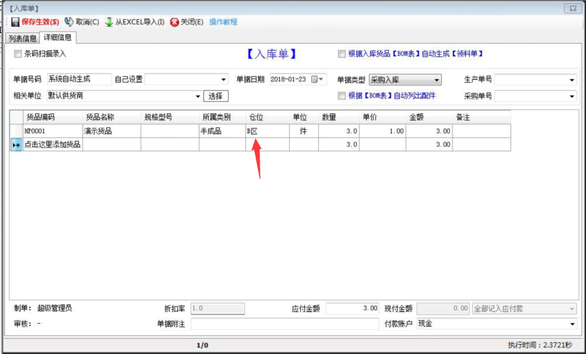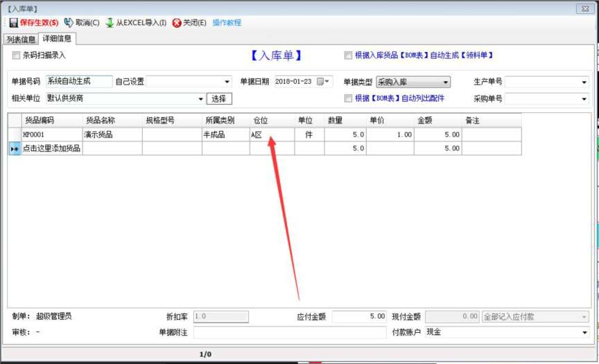 第一:在入庫單界面,入庫貨品的時候需要填寫入庫的貨品入到哪個“倉位”
