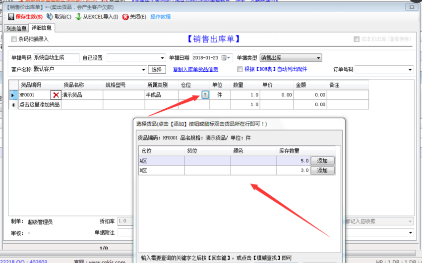 第二:在出庫單界面,出庫貨品的時候需要選擇出庫的是哪個“倉位”的貨品