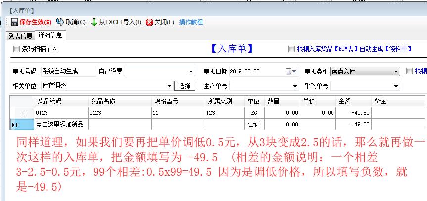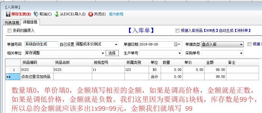 在入庫單上,數(shù)量和單價(jià)我們都填寫為0,金額這里我們填好相關(guān)的金額,即:現(xiàn)在的單價(jià)是2元,我想要的單價(jià)是3元,那么單價(jià)就相差了1元,一個(gè)貨品相差1元,那么99個(gè)貨品,就相差了99元,因?yàn)槲沂前褑蝺r(jià)調(diào)高,所以,金額就填正數(shù)99,如果我是想把金額調(diào)低1元,那么金額我就應(yīng)該填負(fù)數(shù),也就是-99元。