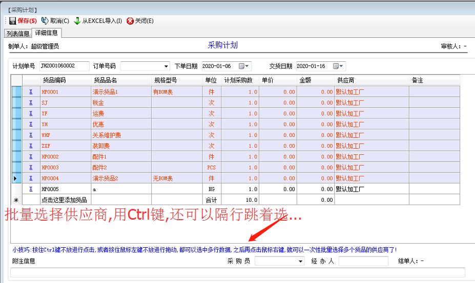 企管王或企管王的工廠版erp系統(tǒng)軟件中采購(gòu)計(jì)劃單批量多選供應(yīng)商功能,在按住Ctrl鍵不放,用鼠標(biāo)左鍵點(diǎn)擊想要選擇的貨品行,就可以實(shí)現(xiàn)選中多行貨品(可以是連續(xù)的,也可以是不連續(xù)的) 如果按住鼠標(biāo)左鍵不放進(jìn)行拖動(dòng),可以實(shí)現(xiàn)連續(xù)選中多行.