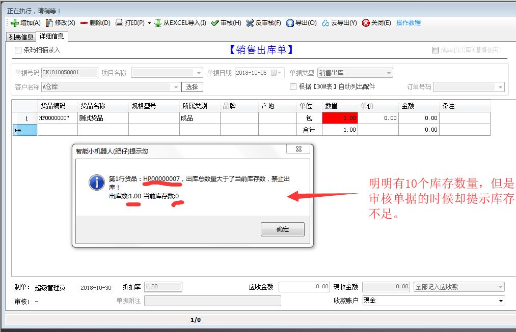 經(jīng)查詢,這個(gè)貨品是在10.25號(hào)才入庫了10個(gè),在入庫了10個(gè)之后,庫存才有10個(gè),也就是說:在10.25號(hào)之前,這個(gè)貨品是1個(gè)庫存都沒有的。現(xiàn)在就已經(jīng)很清楚了,用戶在10.5號(hào)出庫的時(shí)候倉庫根本就是沒有庫存的,所以,系統(tǒng)提示庫存不足不能出庫,是完全正確的。