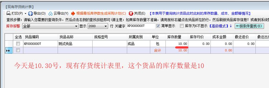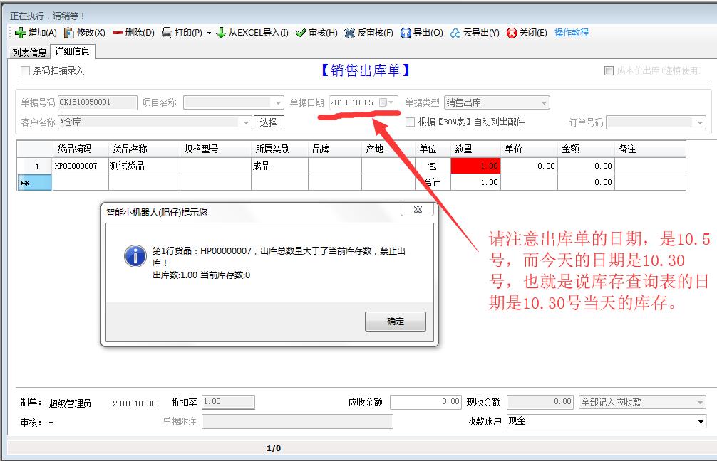 細(xì)心的用戶應(yīng)該發(fā)現(xiàn)了,出庫單的單據(jù)日期是10.5號(hào),而今天的日期是10.30號(hào),也就是說,這是在10.30號(hào)這天補(bǔ)錄的10.5號(hào)的一張出庫單。而我們在統(tǒng)計(jì)報(bào)表里面的庫存查詢表里,查詢的庫存數(shù)量是指此時(shí)此刻的數(shù)量,也就是10.30號(hào)的庫存數(shù)量。大家可以思考一下,你10.30號(hào)的時(shí)候有100塊錢,能代表你10.5號(hào)的時(shí)候就有100塊錢嗎?