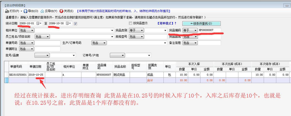 同樣的道理,10.30號(hào)有10個(gè)庫存,并不代表你10.5號(hào)的時(shí)候就有10個(gè)庫存。為了驗(yàn)證一下,我們到統(tǒng)計(jì)報(bào)表里面的進(jìn)出存明細(xì)表里做了一個(gè)查詢。查詢結(jié)果如下: