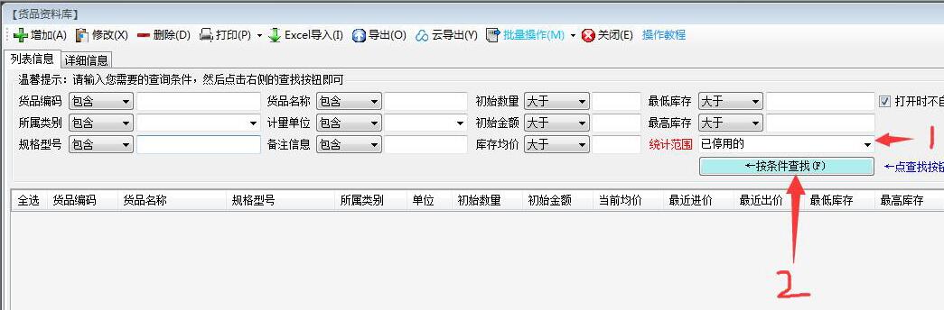 首先,我們依次點(diǎn)擊【基礎(chǔ)數(shù)據(jù),貨品管理】,在貨品管理界面,將已經(jīng)停用的貨品先查詢出來。(點(diǎn)擊圖片可以查看清晰大圖)