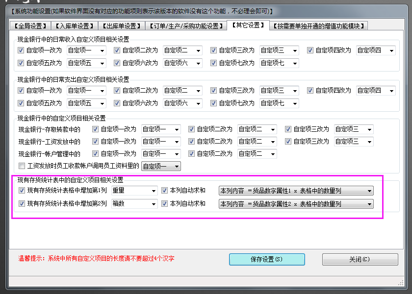 第一步:在系統(tǒng)管理,系統(tǒng)設(shè)置,系統(tǒng)功能設(shè)置,全局設(shè)置里,增加貨品的數(shù)字屬性,比如單重