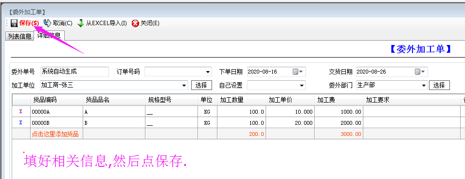 第二步:可以開(kāi)委外加工單了,當(dāng)然貨品的BOM表,工序表之類(lèi)的建立這里就不多了,這些是最基本的。如果還沒(méi)有建好,可以看一下我們其它的相關(guān)教程。
