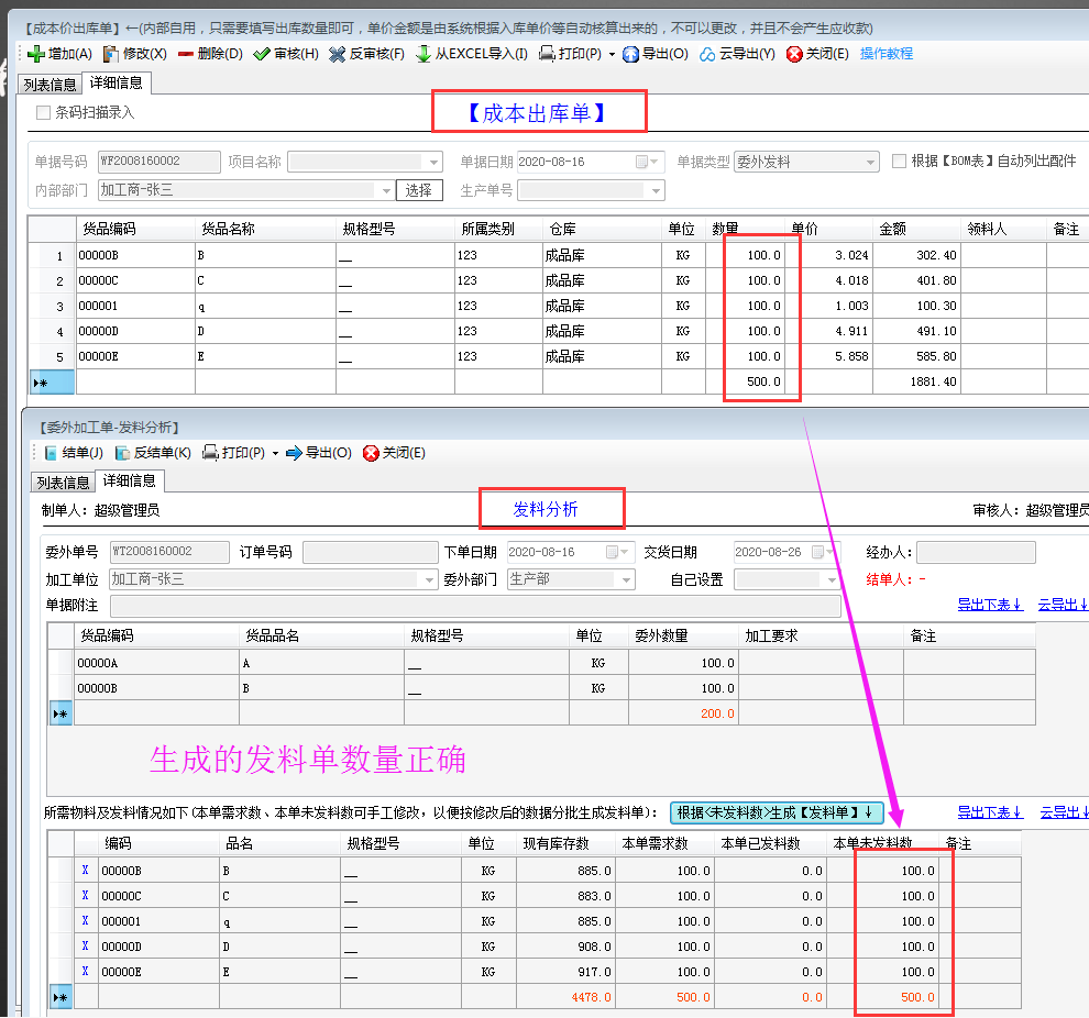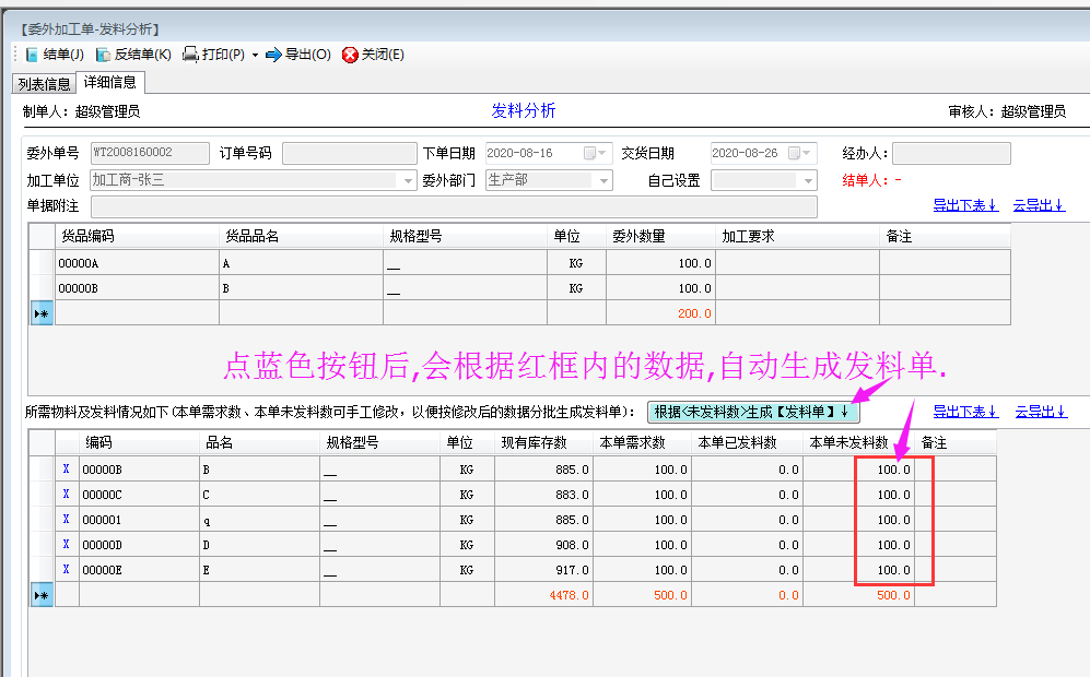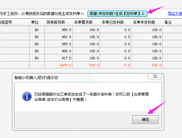 點(diǎn)這個(gè)藍(lán)色的按鈕可以自動(dòng)根據(jù)還沒(méi)有發(fā)料的數(shù)量生成發(fā)料單(發(fā)料單就是軟件里的成本價(jià)出庫(kù)單)