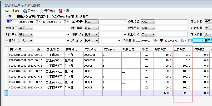 發(fā)料單審核之后就生效了,之后再來(lái)看一下發(fā)料情況跟蹤表