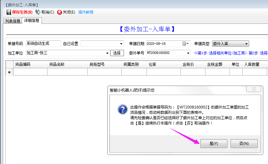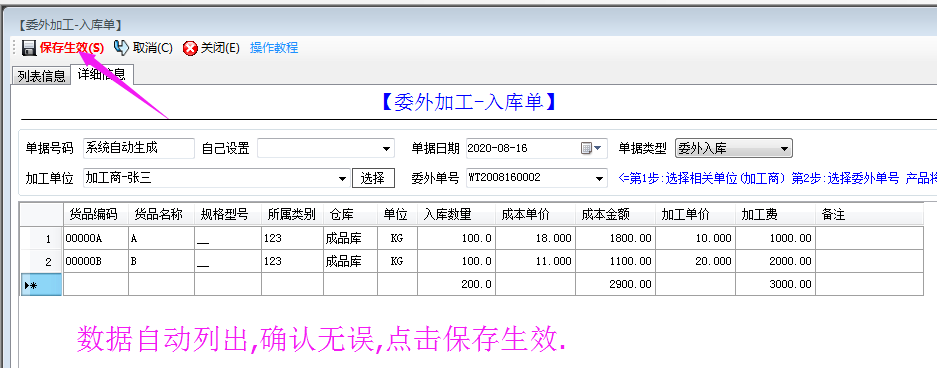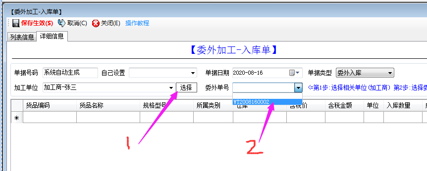 先選加工商,再選對(duì)應(yīng)的委外加工單號(hào),系統(tǒng)就會(huì)自動(dòng)幫你列出來(lái)你應(yīng)該入庫(kù)什么,非常方便