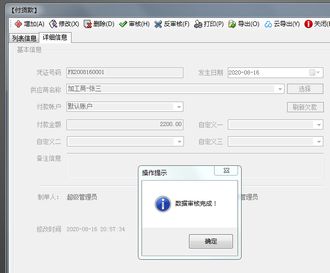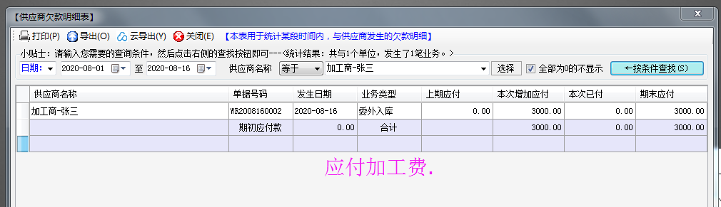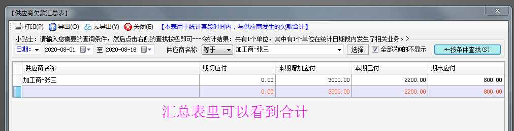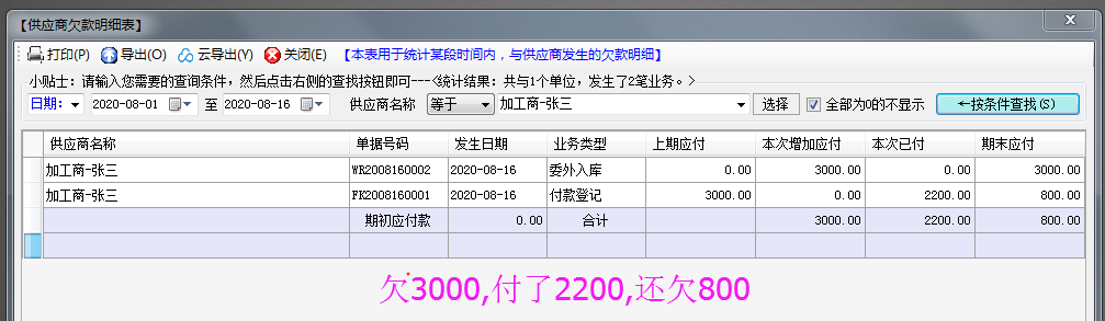 再來(lái)看一下欠款明細(xì)表,應(yīng)付3000,已付2200,還欠800 沒(méi)有問(wèn)題。