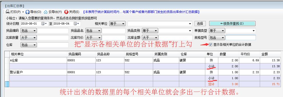 在免費(fèi)版erp管理系統(tǒng)軟件的出庫匯總表中增加顯示各相關(guān)單位合計(jì)數(shù)據(jù)的功能(就是按相關(guān)單位分類匯總合計(jì)統(tǒng)計(jì)功能)