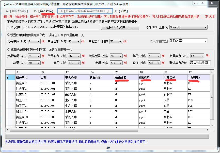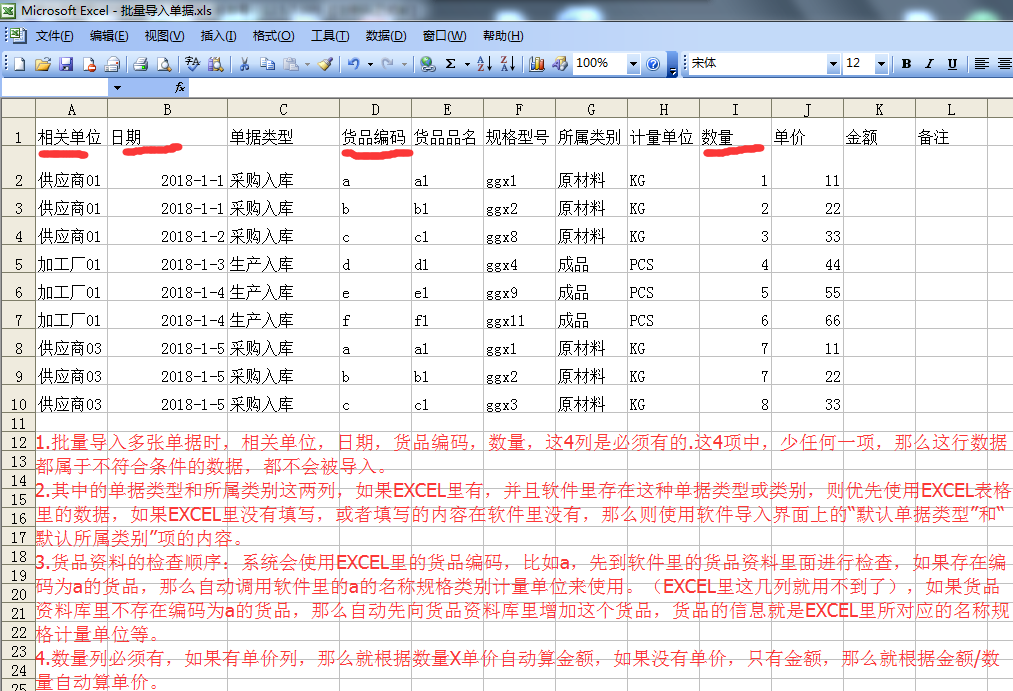 2.相關(guān)單位,日期,貨品編碼,數(shù)量這四列為必填項(xiàng),必須有,其中任何一項(xiàng)沒(méi)有數(shù)據(jù),則這行數(shù)據(jù)不會(huì)被導(dǎo)入。