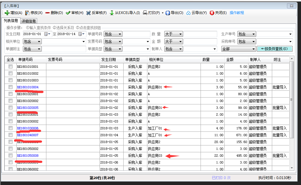 軟件雖然有這個(gè)功能,但是并不是非常建議使用。因?yàn)?,單?jù)正常來(lái)說(shuō),應(yīng)該是每天完成每天的錄入,這樣便于實(shí)時(shí)查詢庫(kù)存等信息。如果批量進(jìn)行不同日期的單據(jù)導(dǎo)入,則說(shuō)明,長(zhǎng)時(shí)間沒(méi)有按日期正常錄入數(shù)據(jù),那么你的庫(kù)存查詢肯定是不準(zhǔn)確的。(比如今天是1.15號(hào)了,實(shí)際上你1號(hào)到15號(hào)的單據(jù)都還沒(méi)有錄入,這時(shí)候查詢庫(kù)存,肯定是不準(zhǔn)確的)