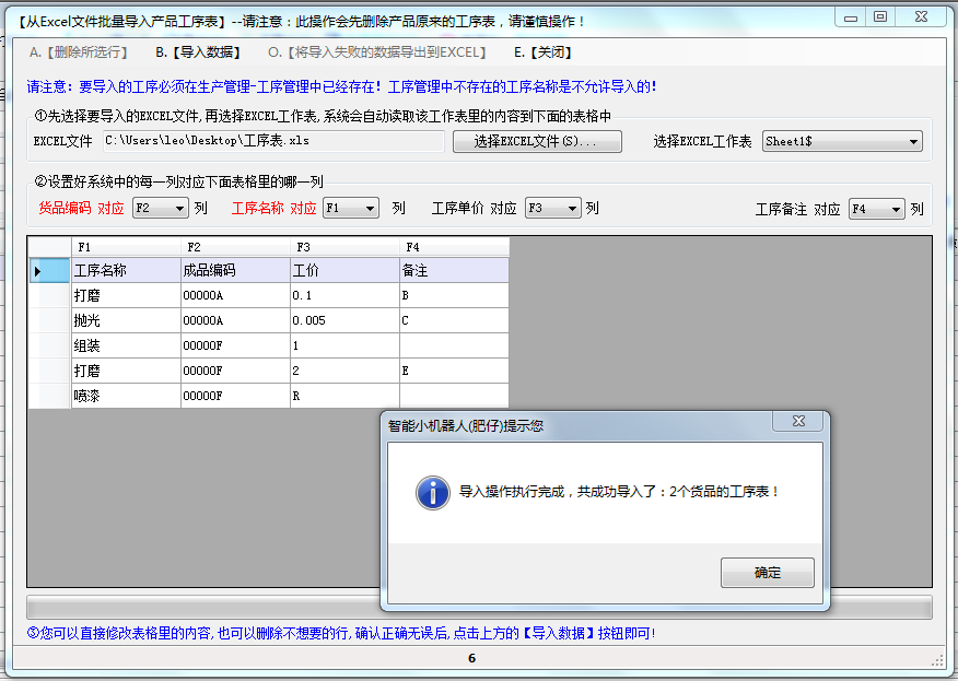 下面是EXCEL批量導(dǎo)入工序表的操作界面,操作方法是一樣的。大家可以參照上面的說明。