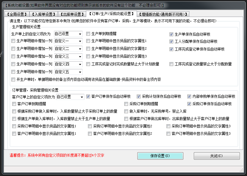 11.可以設(shè)置 客戶訂單,采購計劃單,內(nèi)部申購單,采購訂單保存后是否自動審核。