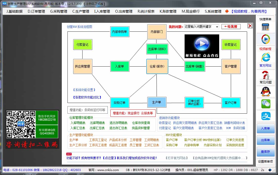 這款ERP系統(tǒng)推薦生產(chǎn)型企業(yè)或工廠客戶使用,它是用來對貨品/物料的采購入庫、生產(chǎn)入庫、銷售出庫、內(nèi)部領(lǐng)料,庫存查詢、欠款統(tǒng)計、利潤統(tǒng)計、客戶訂單、訂單分析(MRP運(yùn)算)、采購、生產(chǎn)加工(BOM表)、計件計時工資,日常收入,日常費用支出,員工工資發(fā)放,銀行存款,取款,轉(zhuǎn)賬,賬戶余額等進(jìn)行全面管理的在操作最簡單最方便最好用這方面排名和排行靠前的小型免費版ERP軟件系統(tǒng)。