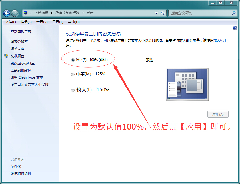 第三步:調(diào)整為默認大小(100%),后點擊邊的【應用】