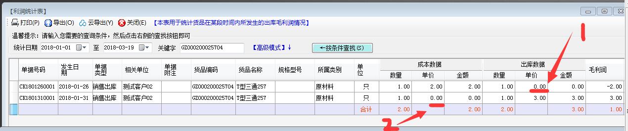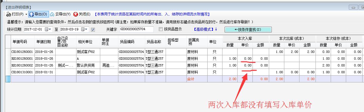 接下來,我們再看一下上圖中的第二行數(shù)據(jù),2018.1.31號的,還是出庫了1個,成本單價是0,銷售單價是3,利潤是3元。也就是成本價沒有顯示出來,這又是為什么呢?其實,也很簡單,就是因為用戶在入庫這種貨品的時候,做入庫單時,沒有填寫入庫單價。我們通過在統(tǒng)計報表里面的進出存明細表里進行查詢,證實了我們上面的分析都是正確的。。。