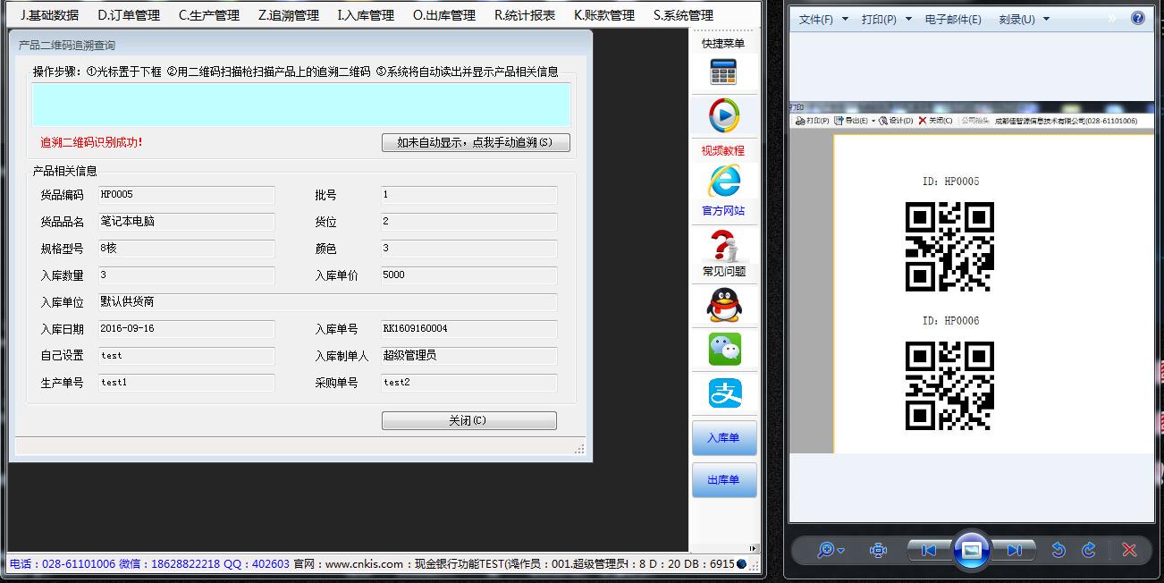 它是用來,在產品生產好入到倉庫的時候(也就是做入庫單的時候),把產品的相關信息自動生成一個二維碼,然后打印出來,貼到產品上面。這樣不管產品經過多少個客戶,不過它銷售到哪里,或者返回來。只要掃描一下它上面的二維碼,就可以查詢到它入庫當于的一些信息。比如入庫時間,對應的生產單號,采購單號,等等。