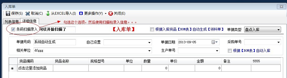 之后,在下面的入庫(kù)單中,把【條碼掃描錄入】打上勾,就可以直接用掃描槍進(jìn)行掃描了。出庫(kù)單中操作方法一樣。