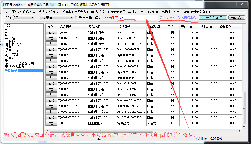 比如我要查詢名稱為“截止閥”的貨品,只需要直接在上面錄入 jzf 三個(gè)字母然后按回車鍵,就可以了。