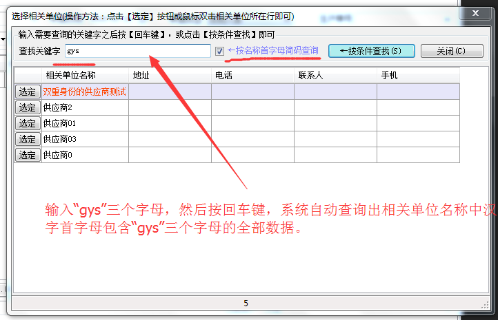 輸入“GYS”三個(gè)字母,然后按回車鍵,系統(tǒng)就會自動查詢出相關(guān)單位名稱中漢字首字母包含"GYS"三個(gè)字母的全部數(shù)據(jù)。