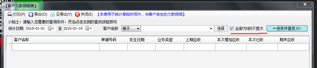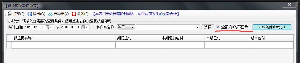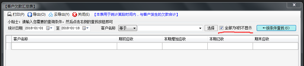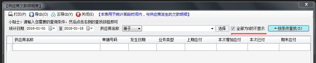 2.客戶欠款明細(xì)表,客戶欠款匯總表,供應(yīng)商欠款明細(xì)表,供應(yīng)商欠款匯總表,這四個(gè)地方增加了一個(gè)查詢過濾條件,可以過濾掉金額全部為0的數(shù)據(jù),讓界面更加簡潔明了。