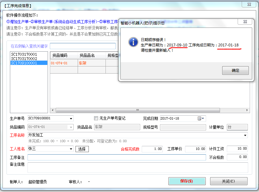 生產(chǎn)管理里面的生產(chǎn)工序完成登記中,保存時(shí)自動檢查完成日期,如果完成日期在生產(chǎn)單的下單日期之前,那么自動提示,并且不允許保存單據(jù)。以防止用戶錄入錯(cuò)誤的數(shù)據(jù)。