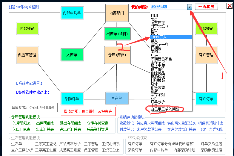 在軟件主操作界面上的導(dǎo)航流程圖上,有一個(gè)問(wèn)題查詢界面,在這里,我們可以手工輸入要查詢的問(wèn)題關(guān)鍵字,也可以點(diǎn)擊下攔箭頭,選擇一些常見(jiàn)的問(wèn)題關(guān)鍵字,進(jìn)行查詢。(請(qǐng)注意:輸入問(wèn)題關(guān)鍵字的時(shí)候,盡可能的減少字?jǐn)?shù),并且抓住關(guān)鍵點(diǎn),比如遇到從EXCEL導(dǎo)入貨品資料的時(shí)候,提示格式錯(cuò)誤,無(wú)法導(dǎo)入,這個(gè)時(shí)候搜索的時(shí)候,關(guān)鍵詞就可以寫“EXCEL導(dǎo)入”或 "格式不正確",而不是把整句話全部打進(jìn)去進(jìn)行搜索)