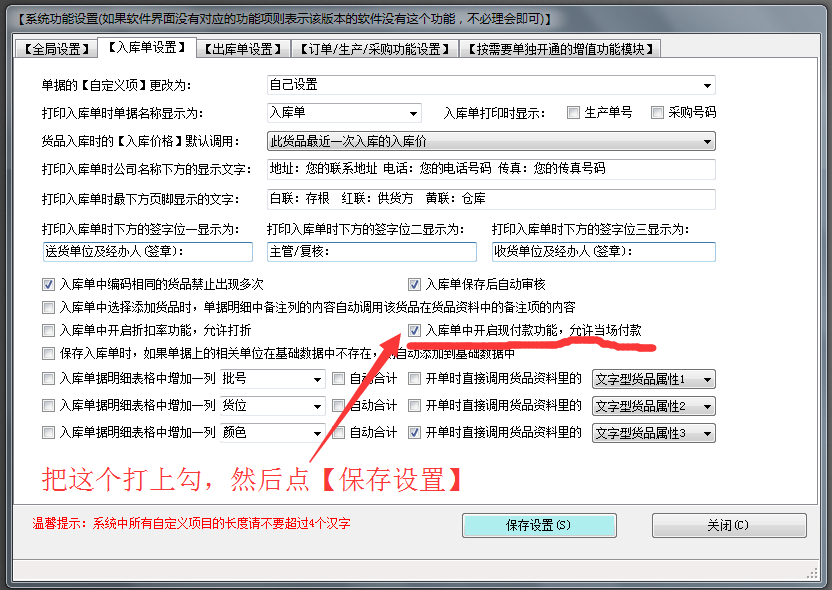 在系統(tǒng)功能設(shè)置里,把【入庫(kù)單中開(kāi)啟現(xiàn)付款功能,允許當(dāng)場(chǎng)付款】打上勾,然后點(diǎn)【保存設(shè)置】。