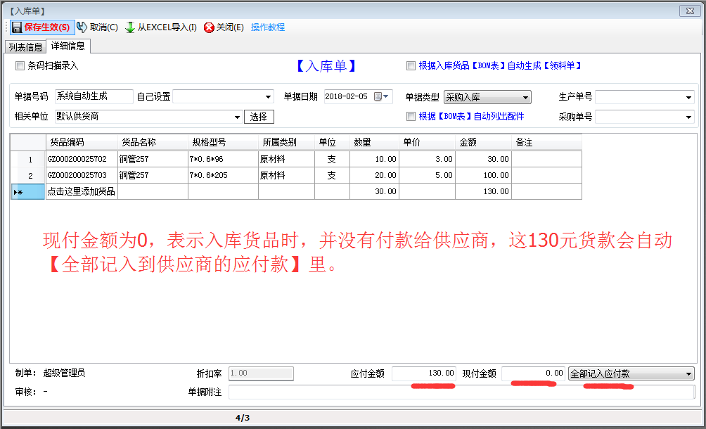 現(xiàn)在先來(lái)講一下軟件里的單據(jù)上的金額的欠款記賬方法。如下圖:這張入庫(kù)單,表示從這個(gè)供應(yīng)商這里買(mǎi)了2種貨品,總的應(yīng)付金額為130元,默認(rèn)情況下直接點(diǎn)【保存】按鈕,那么,系統(tǒng)就會(huì)自動(dòng)在這個(gè)供應(yīng)商的欠款里增加一筆130元的欠款。(因?yàn)檫@里的現(xiàn)付金額為0,并且后面的款項(xiàng)模式為:全部記入應(yīng)付款)