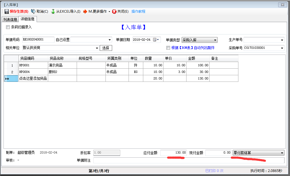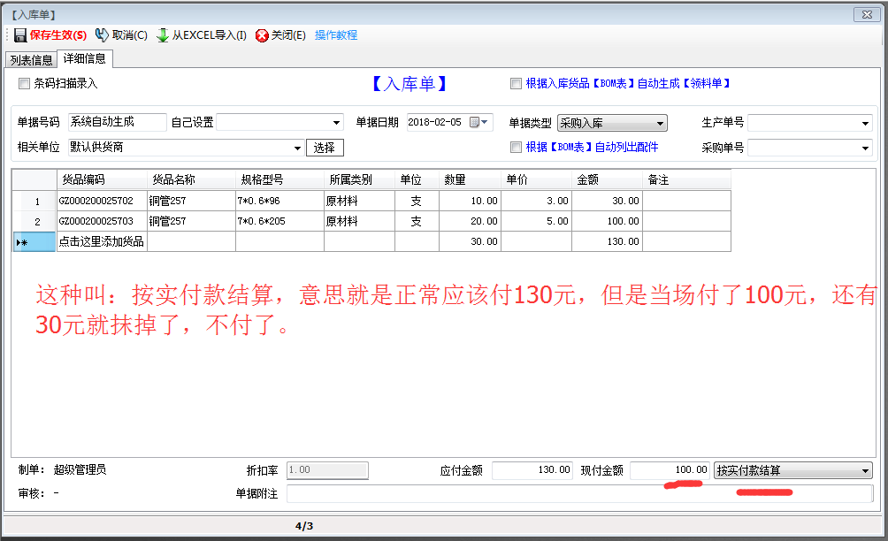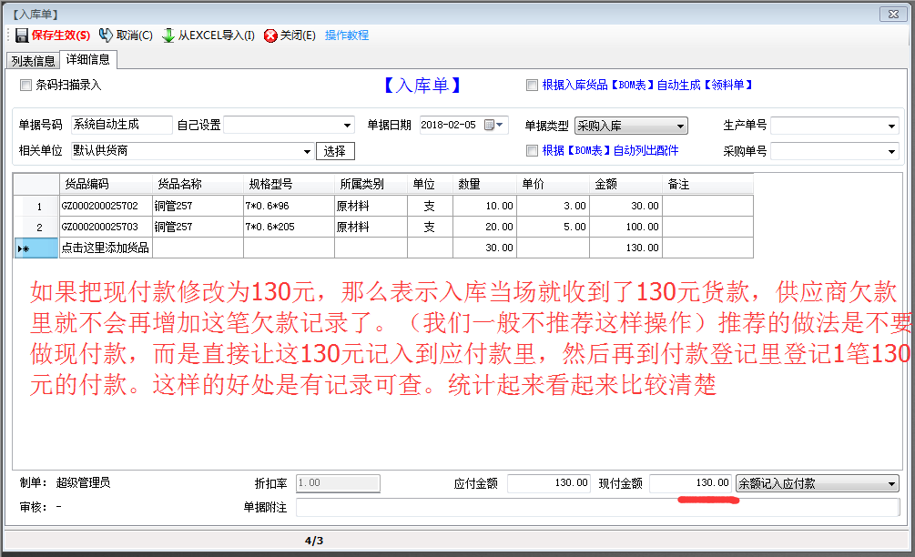 如果把現(xiàn)付金額修改為130元,就表示當(dāng)場(chǎng)就收到了130元。表示這筆貨款就已經(jīng)結(jié)清了,后面的供應(yīng)商欠款里自然也就不會(huì)再增加這筆130元的欠款記錄了。(但是我們并不建議這樣做)