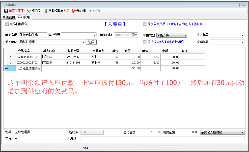還有一種情況就是,當(dāng)場(chǎng)付了一部份。比如正常應(yīng)該付130元,當(dāng)場(chǎng)只付了100元,還有30元沒(méi)付,后面選擇的是余額記入應(yīng)付款。那么系統(tǒng)就會(huì)自動(dòng)增加一筆30款的欠款到這個(gè)供應(yīng)商的欠款記錄里。