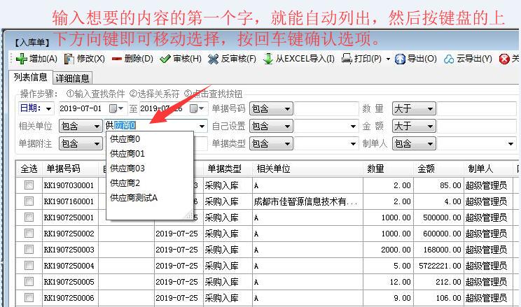 很多客戶在使用erp軟件系統(tǒng)的時(shí)候,經(jīng)常會(huì)進(jìn)行點(diǎn)擊下拉選擇框選擇某項(xiàng)數(shù)據(jù)的操作,如果選擇比較少的情況下倒還沒有什么,但是如果選擇項(xiàng)比較多,比如幾百條或者上千條的時(shí)候,那選起來就有點(diǎn)麻煩了,為了讓大家用起來更加方便一些,我們?cè)谄蠊芡鹾推蠊芡跸盗泄芾碥浖?,增加了一個(gè)下拉選擇框模糊查詢功能,下面我們就來給大家簡(jiǎn)單介紹一下這個(gè)功能的使用方法: