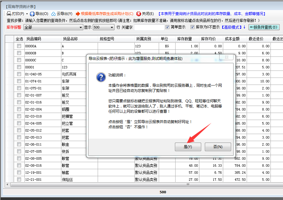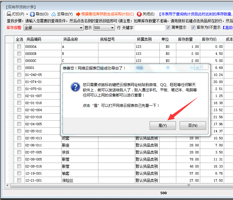 已經(jīng)成功將表格中的庫存數(shù)據(jù)導(dǎo)出來云報表,并且已經(jīng)將網(wǎng)址復(fù)制好了。只需要在QQ,或者微信里點右鍵,粘貼到聊天窗口,就可以發(fā)送給同事進(jìn)行查看了。在下面的界面上,我們可以點擊【是】在自己的電腦上,查看一下云報表是什么效果。