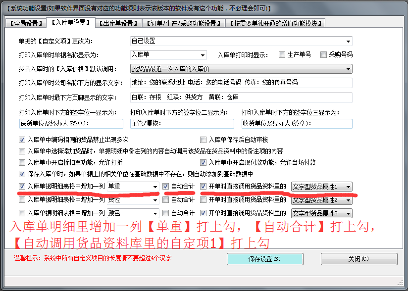 然后再點(diǎn)擊上面的選項(xiàng)卡【入庫單設(shè)置】,把【入庫單據(jù)明細(xì)表格中增加一列】打上勾,然后后面錄入【單重】,然后再把【自動(dòng)合計(jì)】打上勾,再把【開單時(shí)直接調(diào)用貨品資料里的文字型貨品屬性1】打上勾。