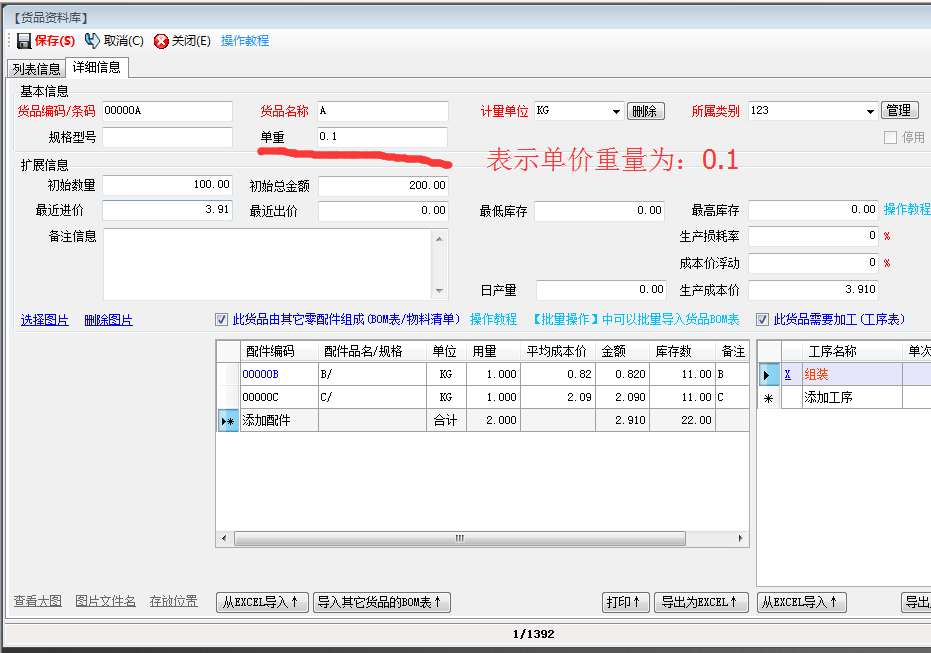 在貨品資料庫里,設(shè)置好貨品的單重值為:0.1