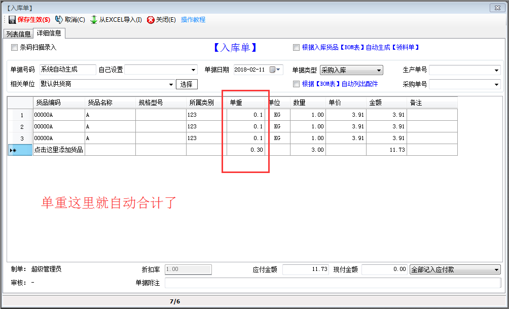 入庫單里的單重這一列在你選擇了貨品后就會(huì)自動(dòng)顯示合計(jì)了。